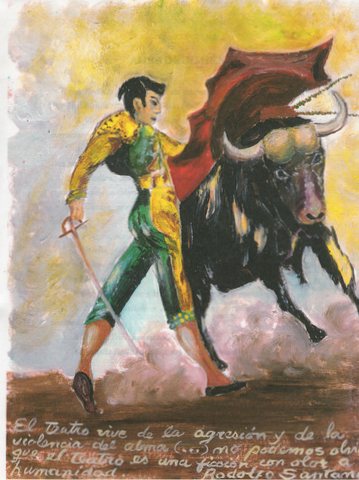 «Mirando al Tendido» fue la pieza que seleccionamos como centro de la indagación, y es que Rodolfo se nos hizo rápidamente un torero que enfrenta su propio espíritu creativo, el toro que dentro de él busca posibilidades de salida, de expresión. Una y otra vez el fue herido por esa bestia con la cual en alguna ocasión hizo las pases, pero que desde tu temprana niñez ya se había manifestado a través de la lectura de grandes clásicos que emergían de la biblioteca de su abuelo.